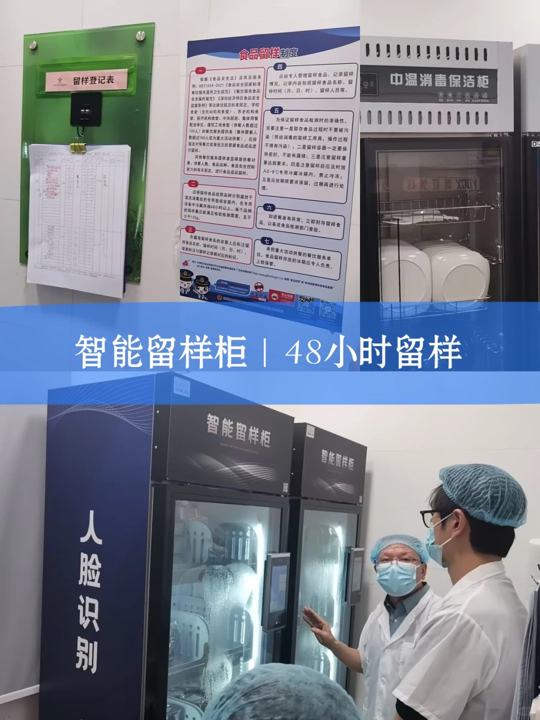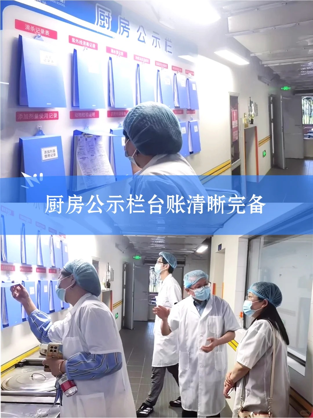 留样区里,当天每道菜品都按规定留了样,标注好名称、时间等,并要存够 48 小时以备追溯;食材储存区分类明确,新鲜蔬果、肉类、粮油整齐摆放,严格 “先进先出”;最显眼的公示栏上,消杀记录、紫外线消毒记录、农药检测报告…… 各种台账明细到责任人,一笔笔记得清清楚楚,看得人心里踏实!