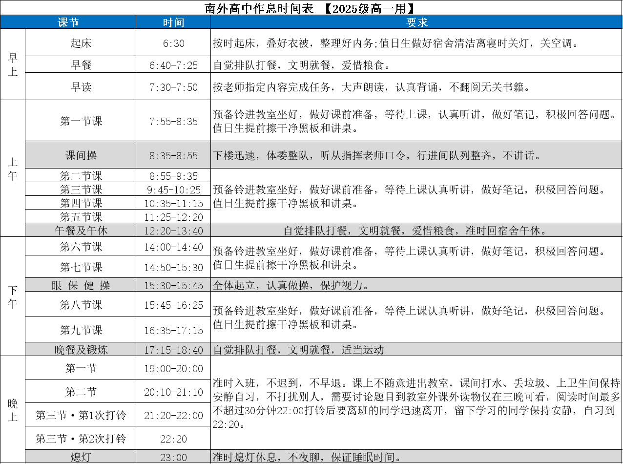 南外作息时间经由老师们科学规划,既能保证教学任务完成,又能保证学生们身体发育(用餐、运动、休息)的需要,还能充分关注学生们精神成长(自我思考、同学交流、休闲)的需要。三年时光,孩子们将在这里长成了让家长们骄傲的模样。高三毕业的同学们普遍怀恋三年充实而快乐的南外生活。具体参考如下: